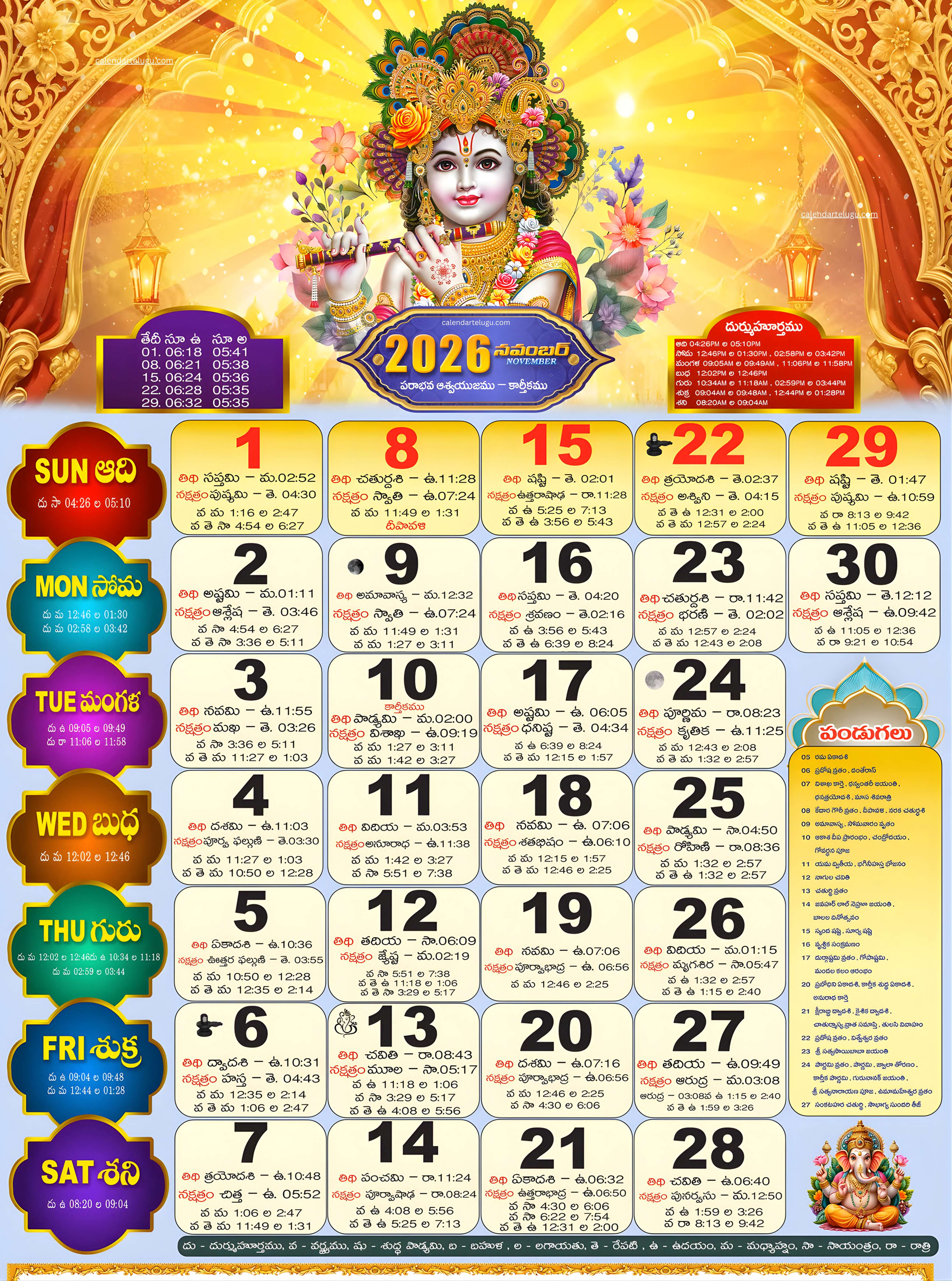 | 13.11.2026 | శుక్రవారము / Friday | నాగ పంచమి, లక్ష్మి పూజ (బెంగాల్) / Naga Panchami, Lakshmi Puja (Bengal) |