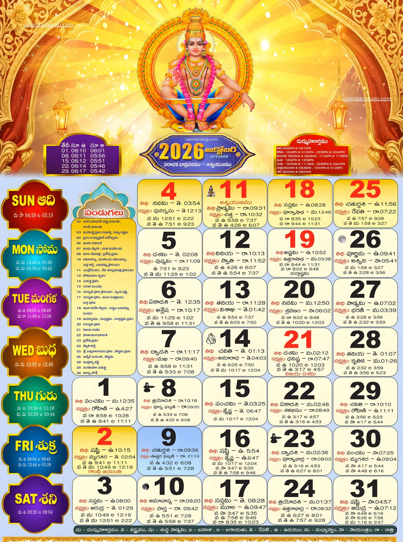 | 03.10.2026 | శనివారము / Saturday | మధ్య అష్టమి, మహాలక్ష్మి వ్రతం ముగింపు / Madhya Ashtami, Mahalakshmi Vratam Ends |